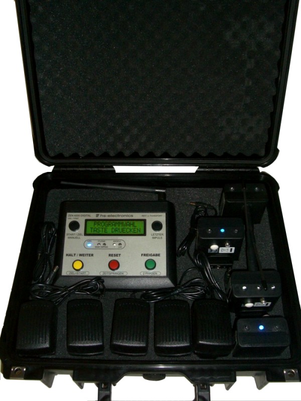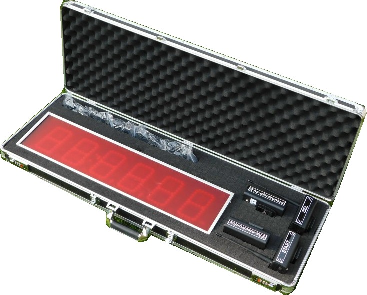 Hier ist die Funk - Anzeigetafel ALED12, 2 Funk - Lichtschranken, 5 Ladegeräte und optional